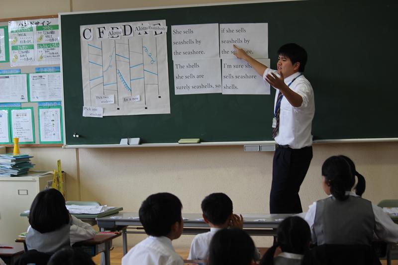 4年生の一コマです。Warm-upとして、4年生の児童はあみだくじと早口言葉に挑戦します。