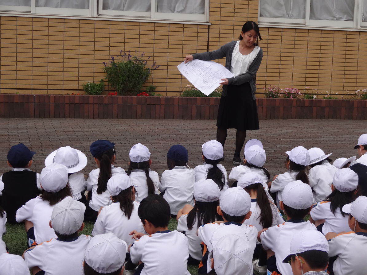 本日の昼休みに,来週行われる遠足(1~3年),宿泊学習(4~6年)の事前指導がありました。1~3年生は,きまりについてお話がありました。