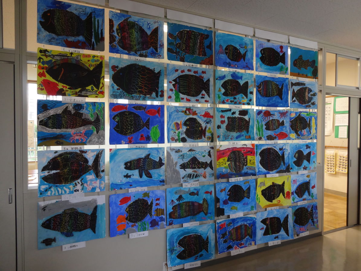 3年生の図工では,クレヨンスクラッチ画に挑戦しました。教室前には,素晴らしい作品がならんでいます。