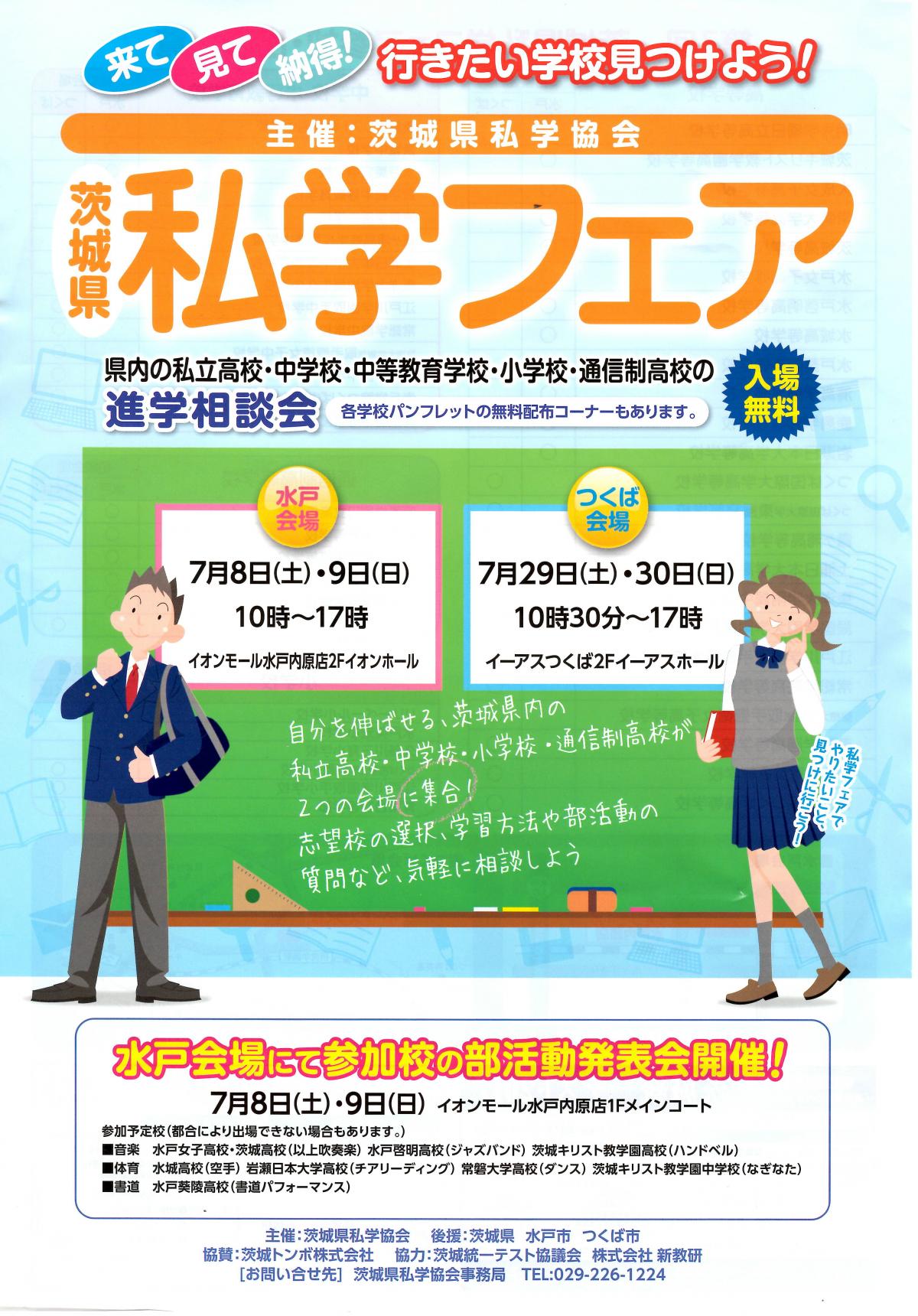 7月8日(土)・9日(日)の両日、『茨城県進学フェア』がイオンモール水戸内原店2Fイオンホールにて開催されます。本校もこのイベントに参加します。みなさんの質問に、教職員が個別にお答えいたします。たくさんの方のご参加をお待ちしております。詳細は、下記ポスターをご覧ください。