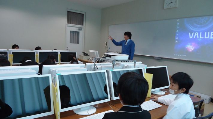コンピュータールームのコンピューターが一新され,最新式の41台が導入されました。パソコンの環境整備が完了しましたので,さっそく2年生が利用を開始しました。