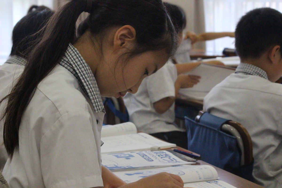 2年生のチャレンジ算数の授業風景。チャレンジ算数では思考力を養う問題に挑戦です。一人ひとりのレベルにあった内容に取り組みます。