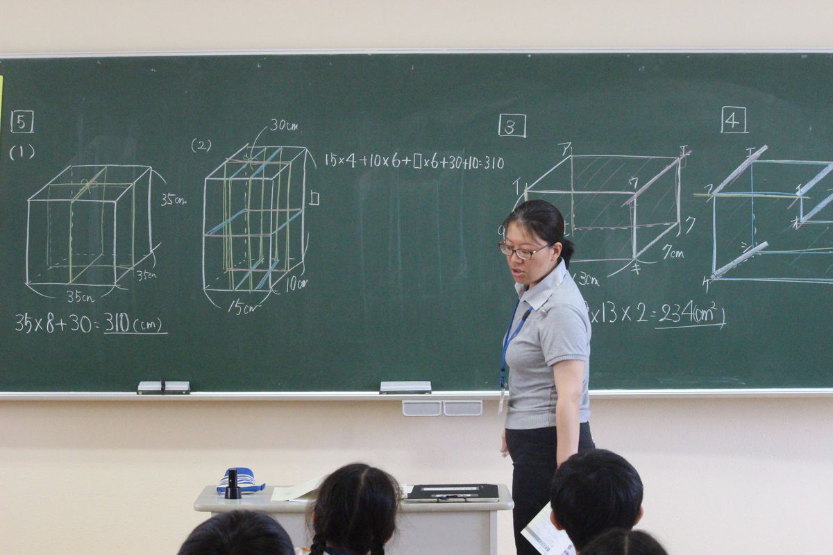 5年生の算数の授業風景。今日は直方体と立方体のまとめです。それぞれの立体の特徴を踏まえて考えます。