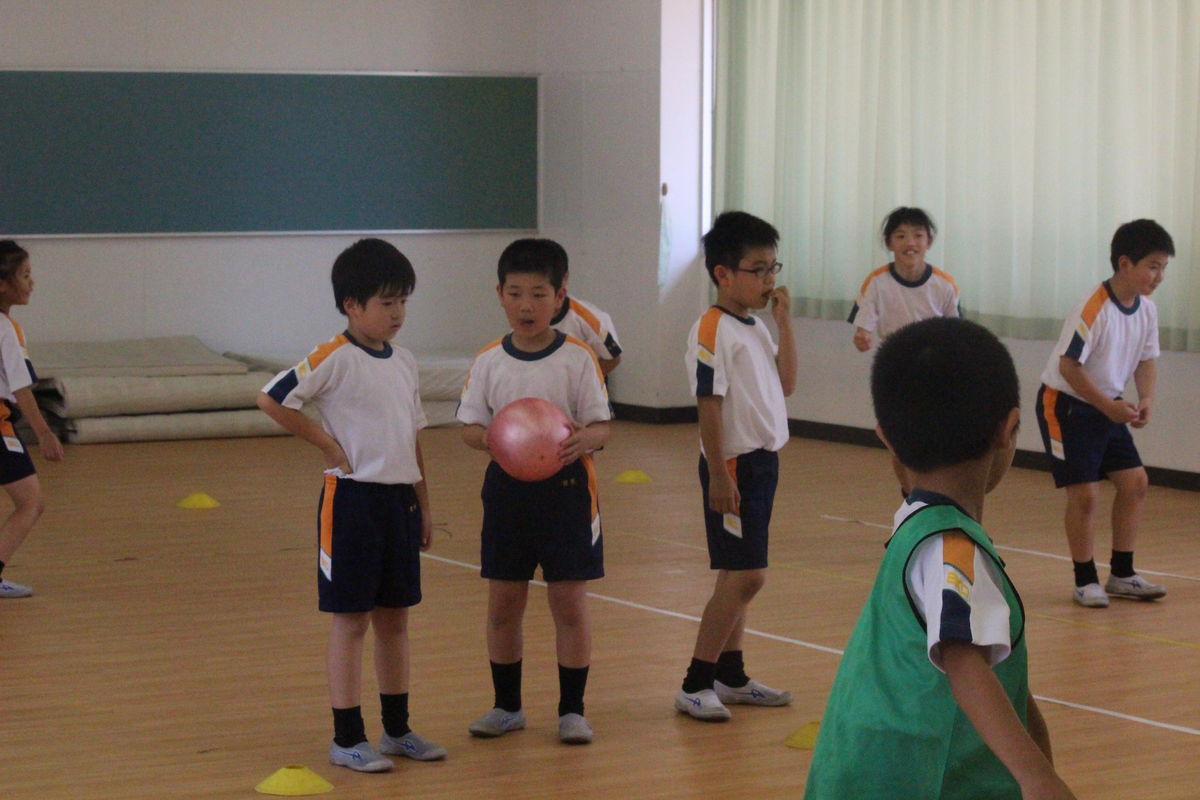 3年生の体育の授業風景。今日の体育は男女混合戦でドッジボールでした。