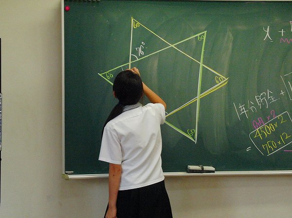 図形の問題解説では、児童が実際に黒板を利用して問題を解きました。