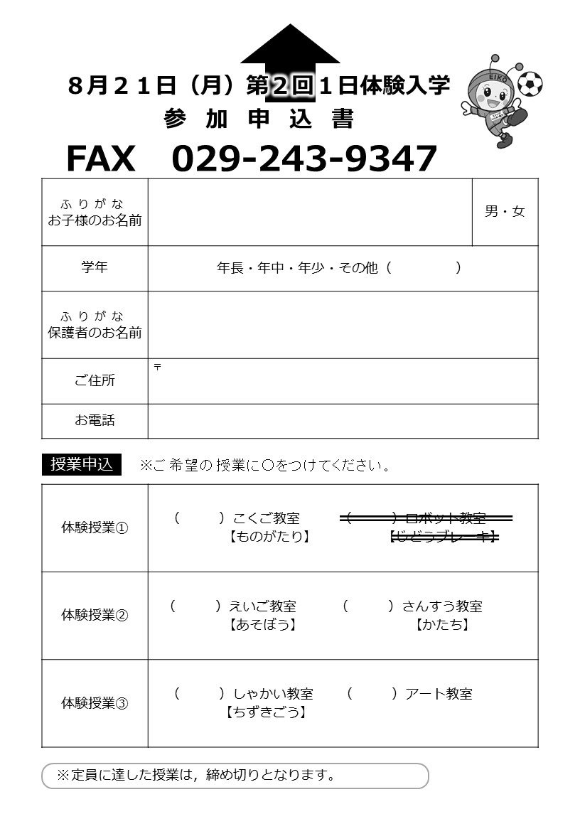 8月21日(月)に第2回たのしい1日体験入学(オープンスクール)を開催します。 当日は授業体験3コマのほか、入試プレテスト(年長対象)、学校説明などを実施いたします。
