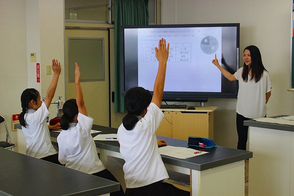 電子黒板を用いた授業。6年生の児童も積極的に手を挙げて答えています。
