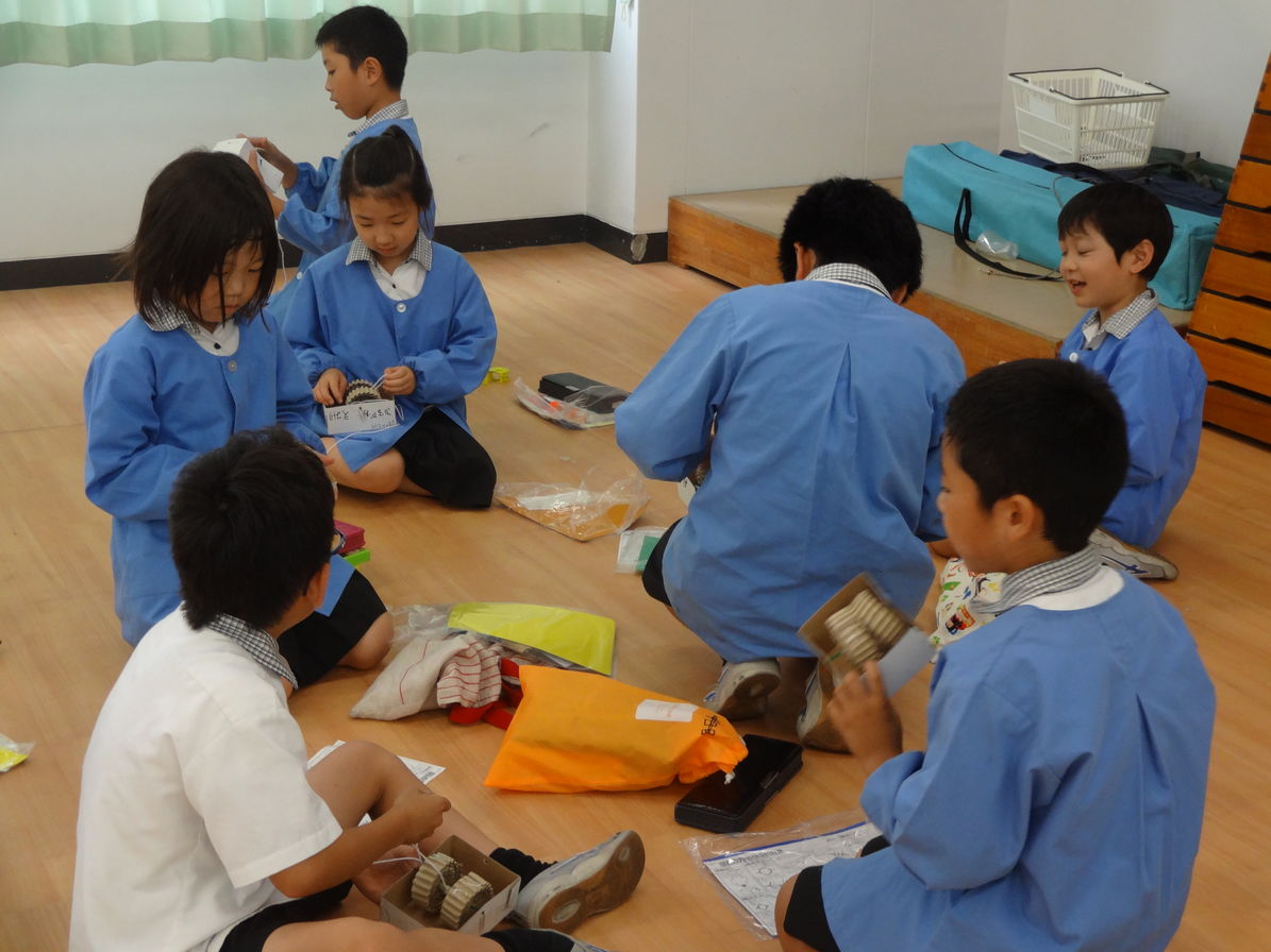 希望者によるクラフト作りです。グループごとに上級生が下級生の面倒を見ながら「ゴムで動くおもちゃ」を作っています。