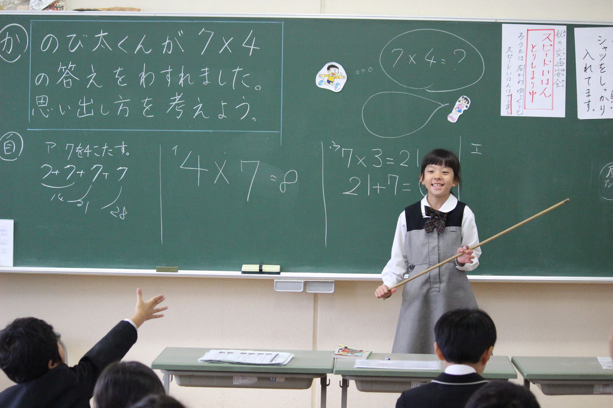 2年生の算数の授業です。「7×4」のいろいろな答えの出し方を先生役になってのび太君に教えてあげます。いろいろな答えの出し方がありますね。