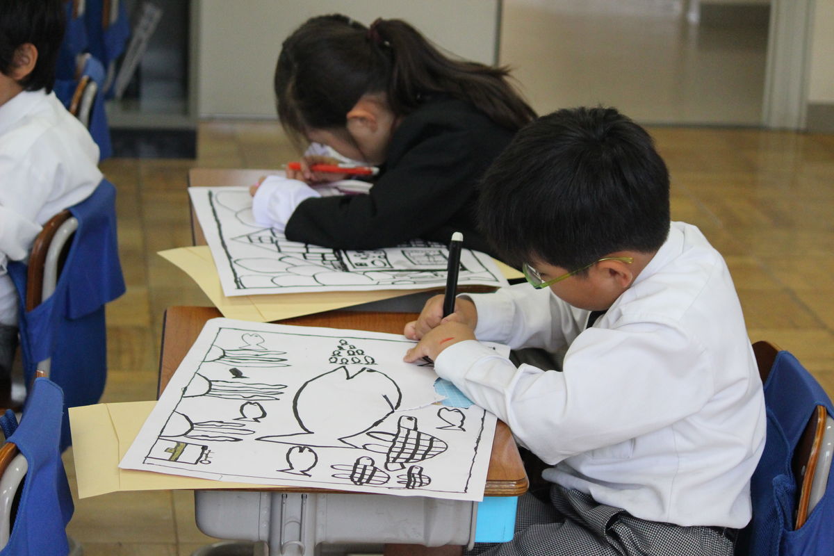 3年生の図工の授業です。紙版画の作成に挑戦です。描いた絵を切り取って絵の具で版画を作ります。みんな真剣に取り組んでいました。