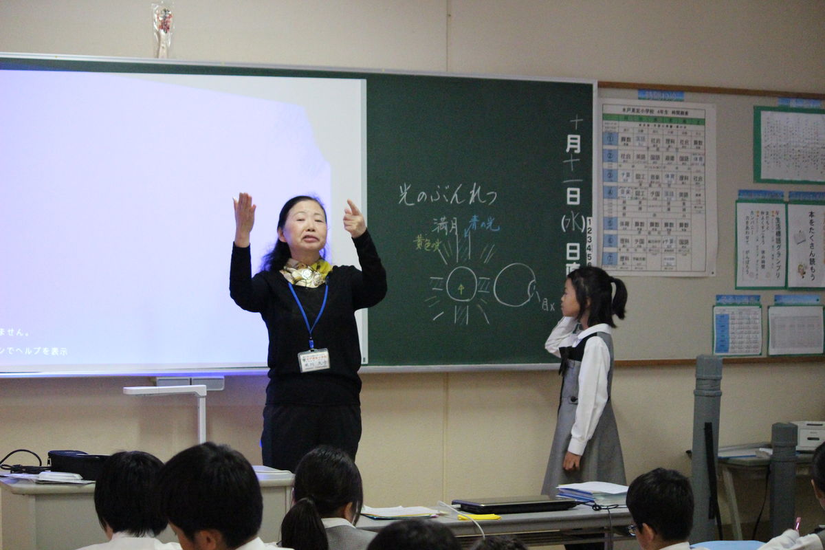 4年生総合科学の授業の様子です。十五夜の月はどうして青と黄色の光になるのかな。