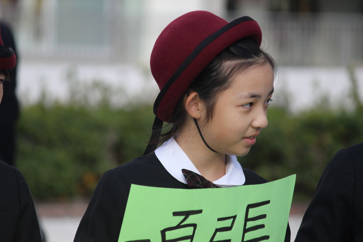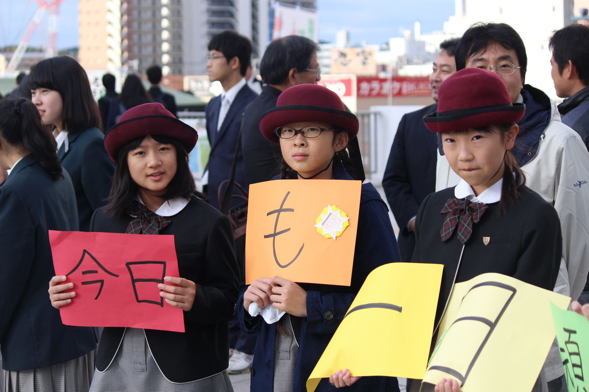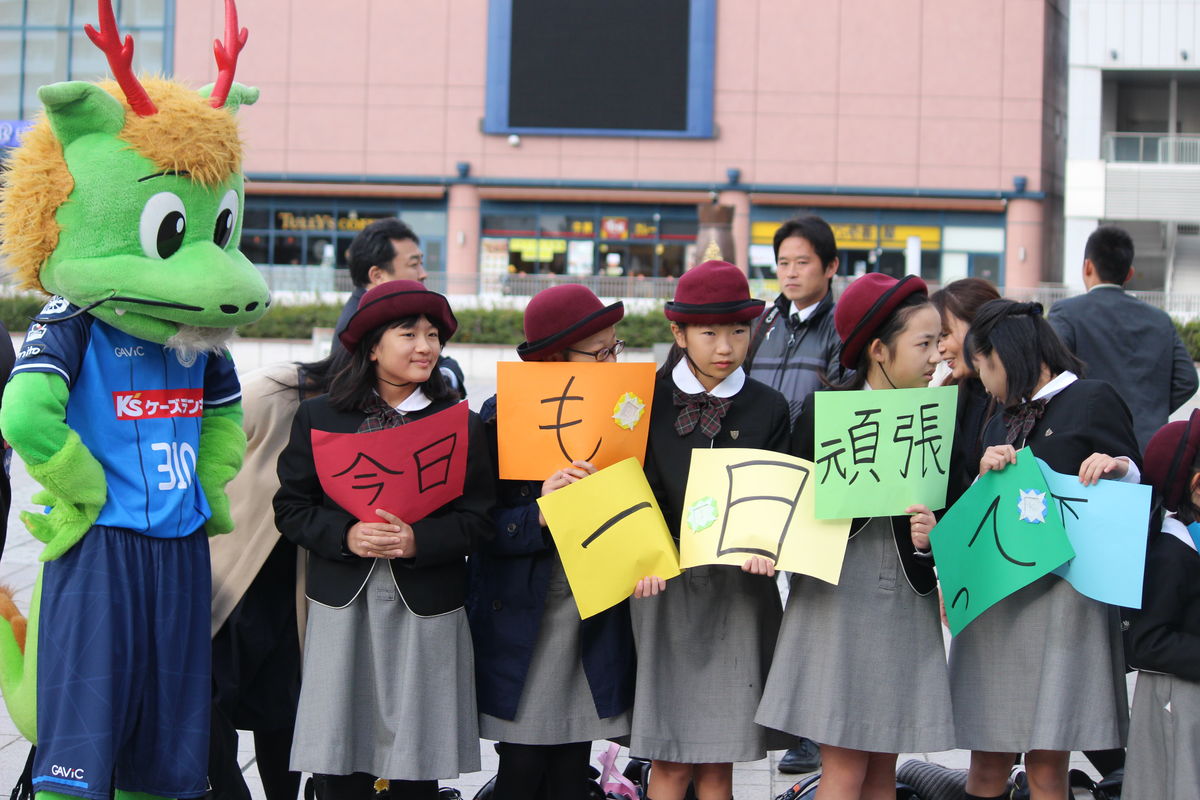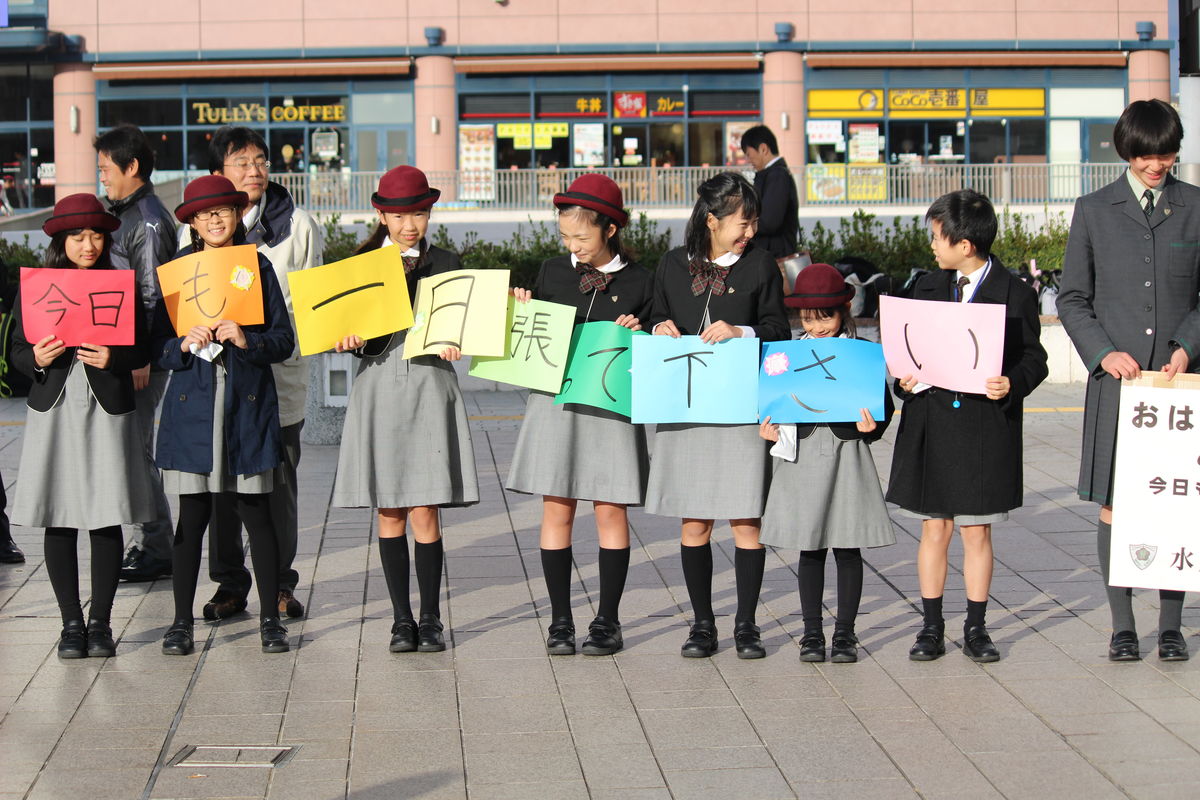 水戸駅前では、幼稚園から高校まで約30の学校からおよそ250人が参加。本校では7人の児童が参加しました。通勤や通学で行きかう人たちに大きな声であいさつしました。