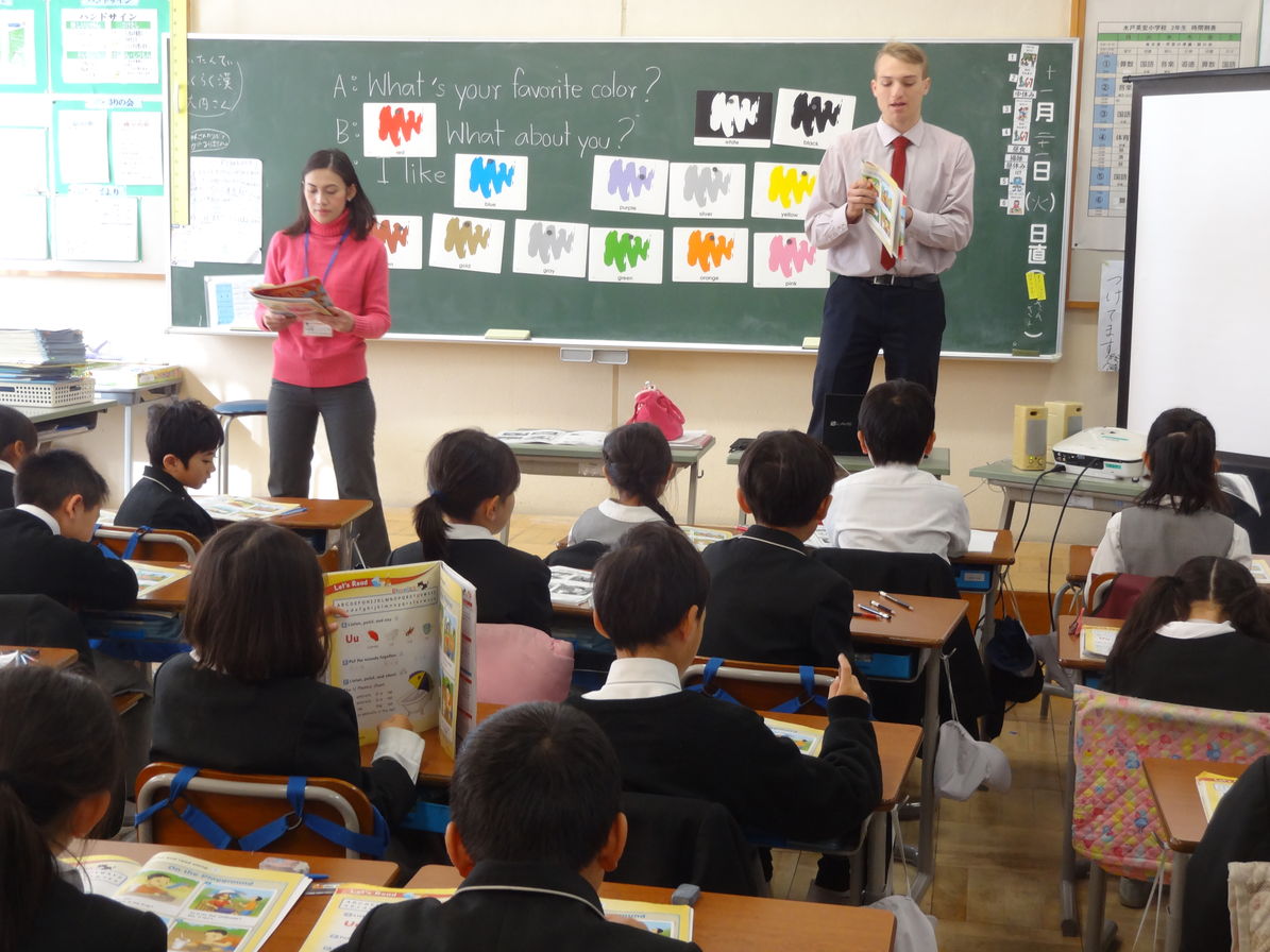 2年生 英語の授業「あなたは,一番好きな色は何ですか。」お互いに英語で質問したり,答えたりして楽しく学んでいました。
