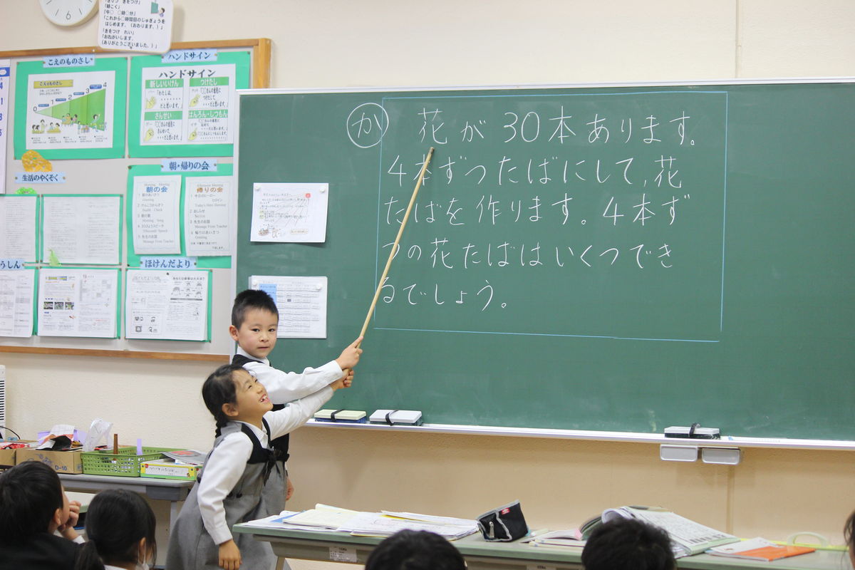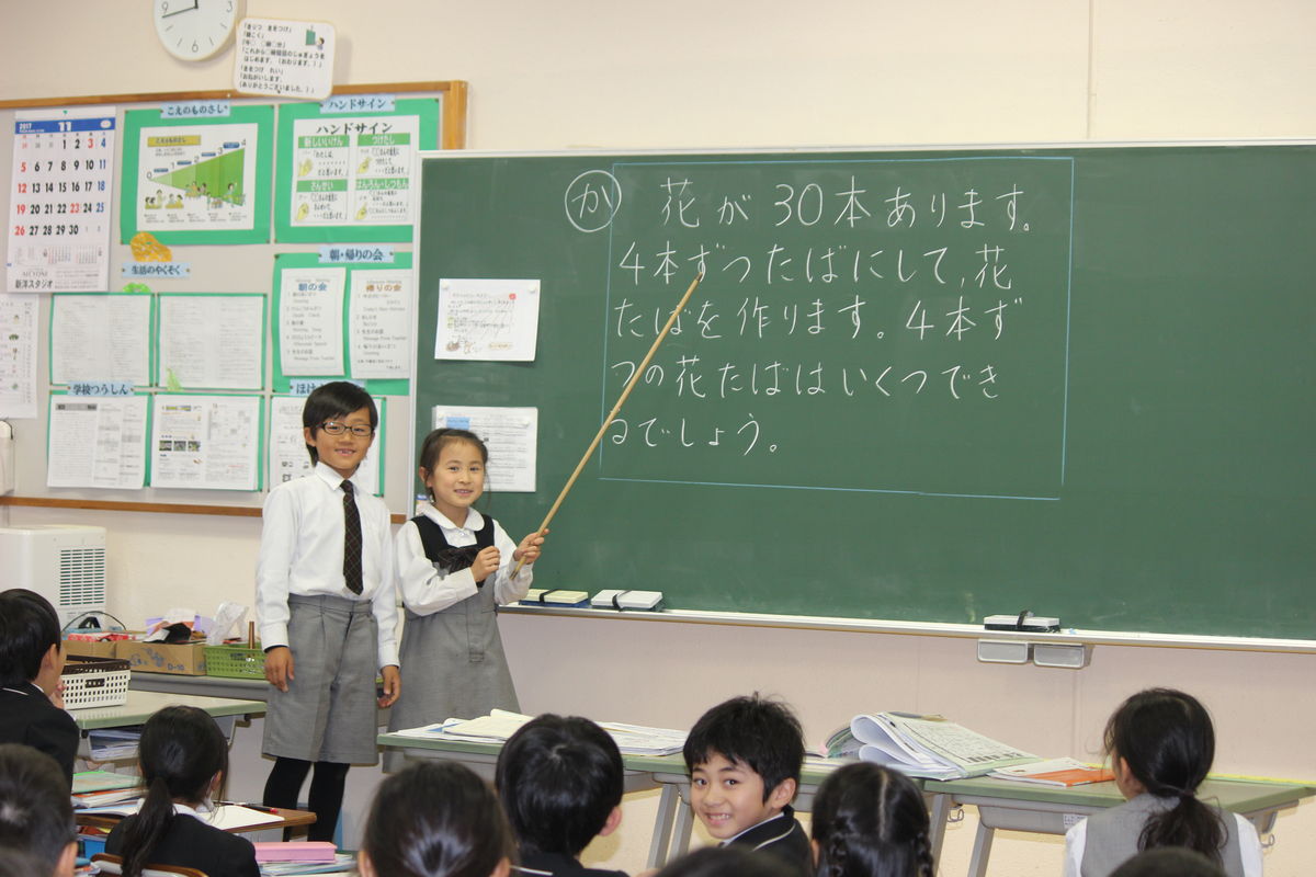 2年生算数の授業① 「今日の課題の確認をしてくれる人!?」 (分数) (野淵先生の投げかけ)