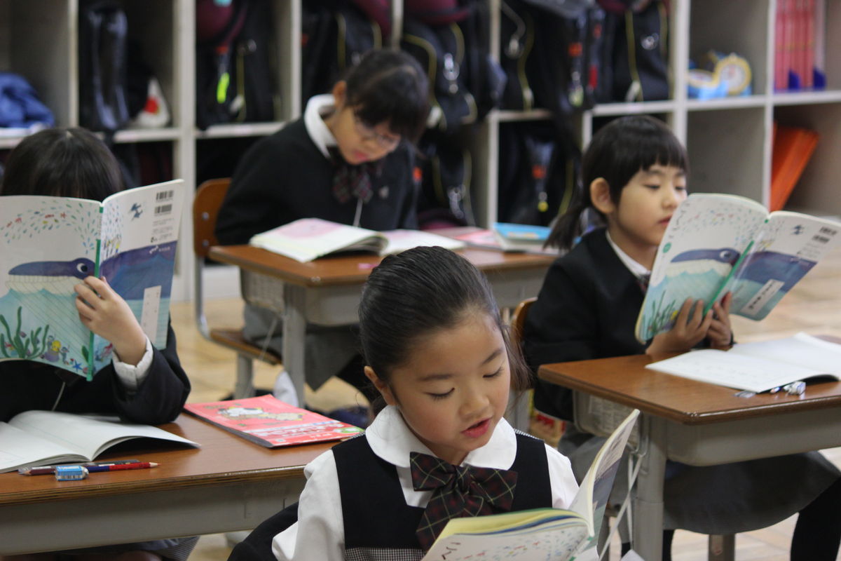 1年生の国語の授業。詩「てんとうむし」の音読風景です。今日の国語は、音読や群読、暗唱などいろいろなことにチャレンジしました。