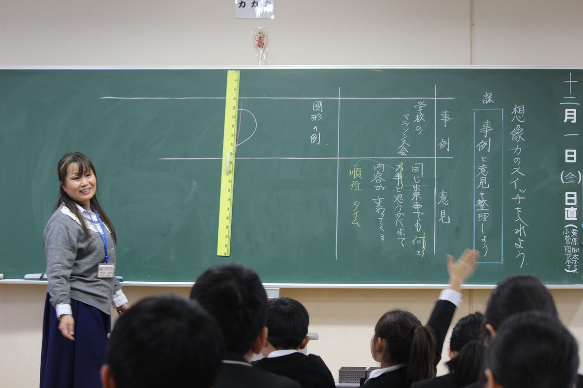 4年生の国語の授業。文章は「想像力のスイッチを入れよう」。メディアから送られてくる情報を受け取る場合、事例と意見の関係をおさえて、自分の考えをまとめることが大事です。