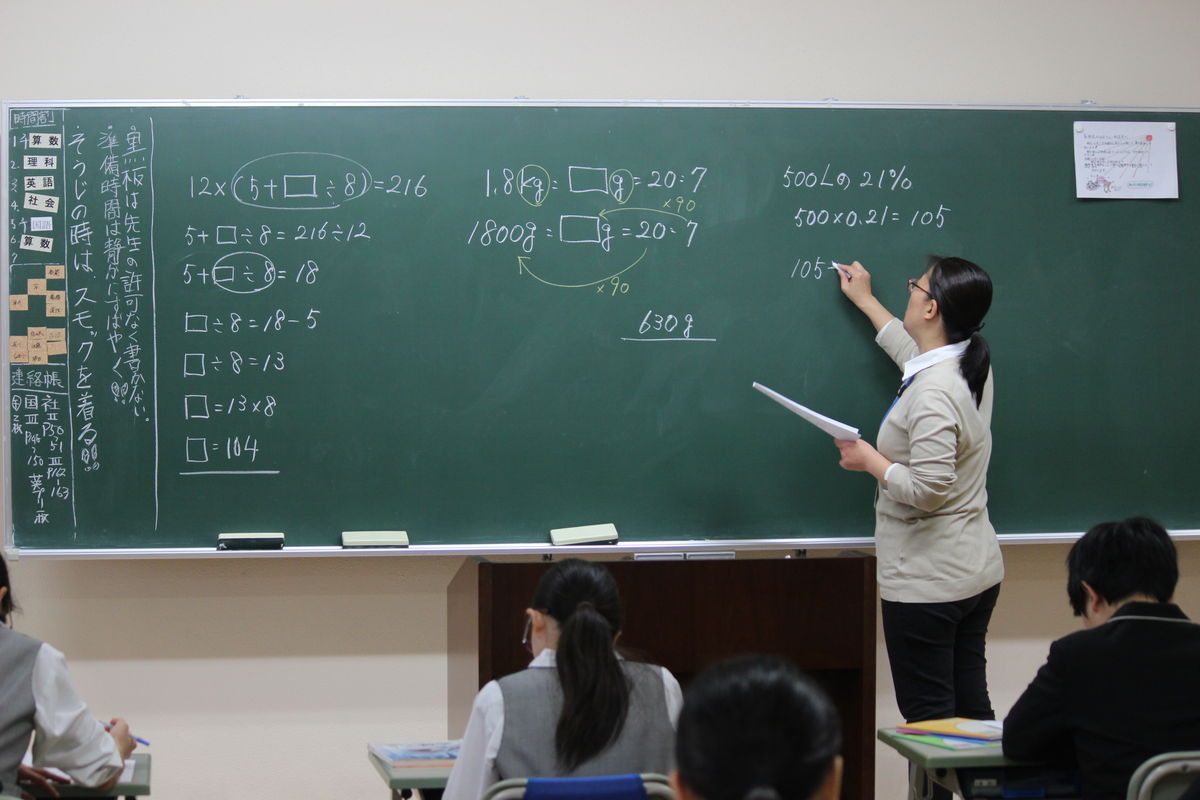 6年生のチャレンジ算数の授業。□を求める虫食い算について学びました。先に計算できるところは計算してシンプルにするのがポイントです。