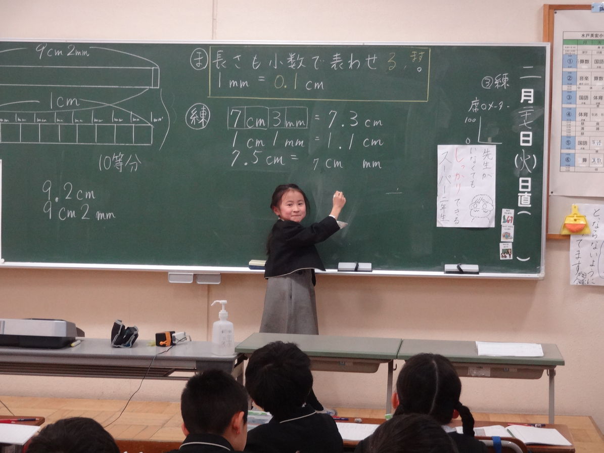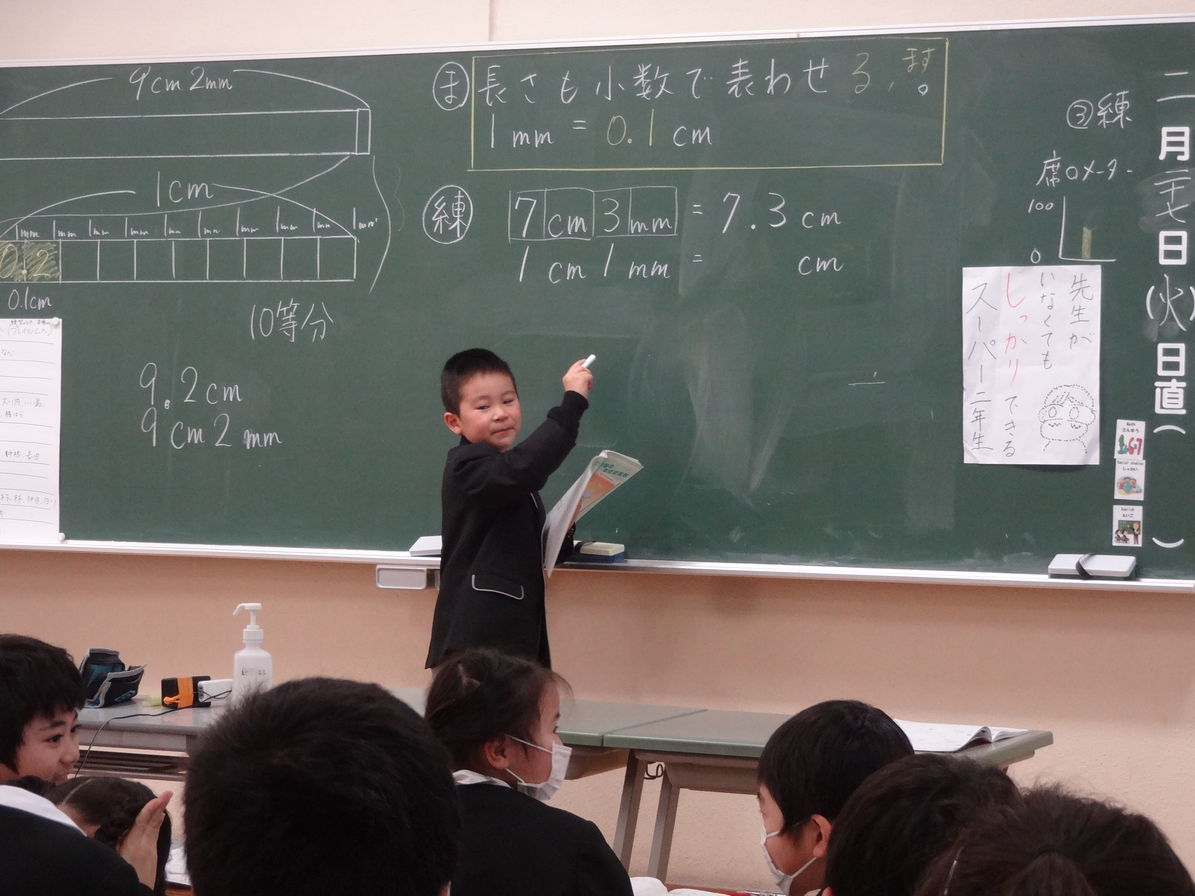 2年生 算数の授業「長さも小数で表せるだろうか。」一生懸命に解いて,説明しています。