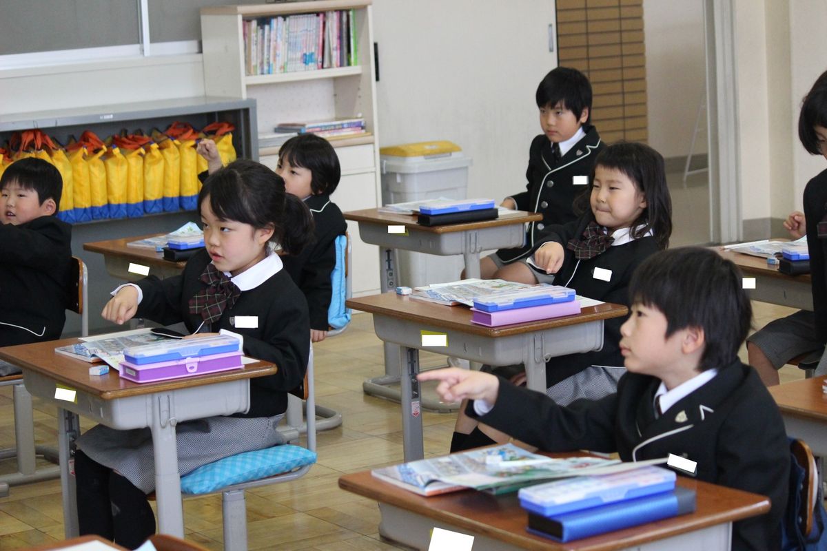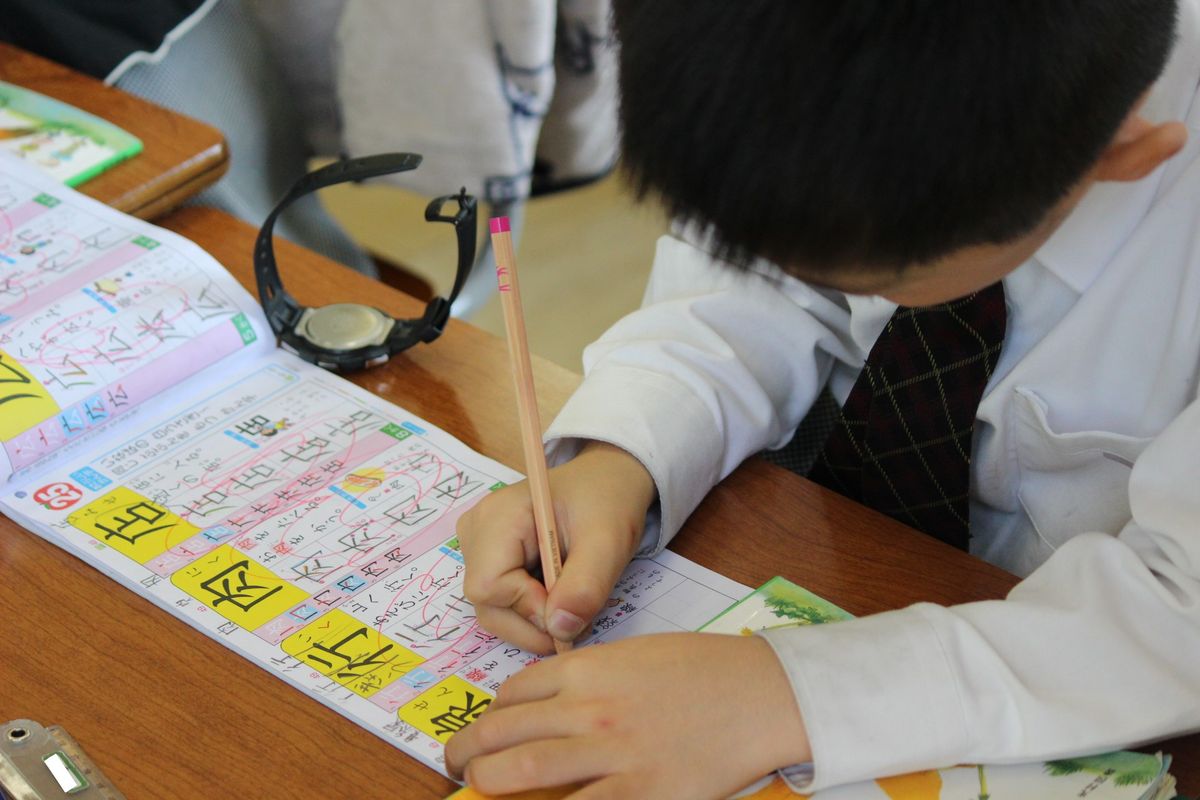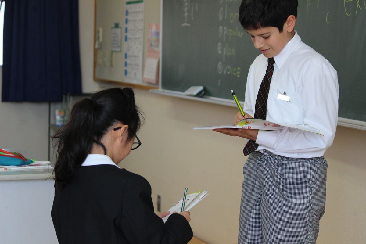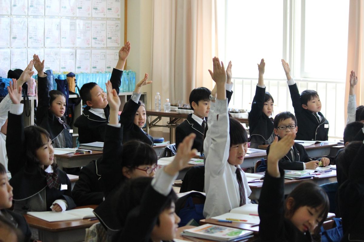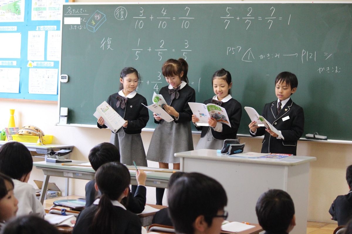 英宏小では土曜日も授業を行っています。前に出て元気に発表しています。