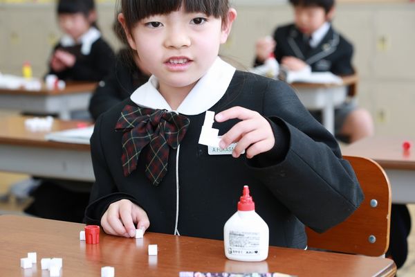 「チャレンジ算数」(スペシャル発展算数)では,今日は難問とブロックによる立体作りです。市販の算数の問題集としては最も難しい「スーパーエリート問題集(文英道)」を使って学んでいます。「3つの数があり,全部たすと74です。一番大きい数から次に大きい数をひくと2になり,2番目に大きい数から1番小さい数をひくと6になります。このとき3つの数を求めなさい。」『和差算』とよばれる問題で,中学入試で出題されるような難問ですが,1年生でもこのような問題に慣れているので,図をかいてていねいに求めます。