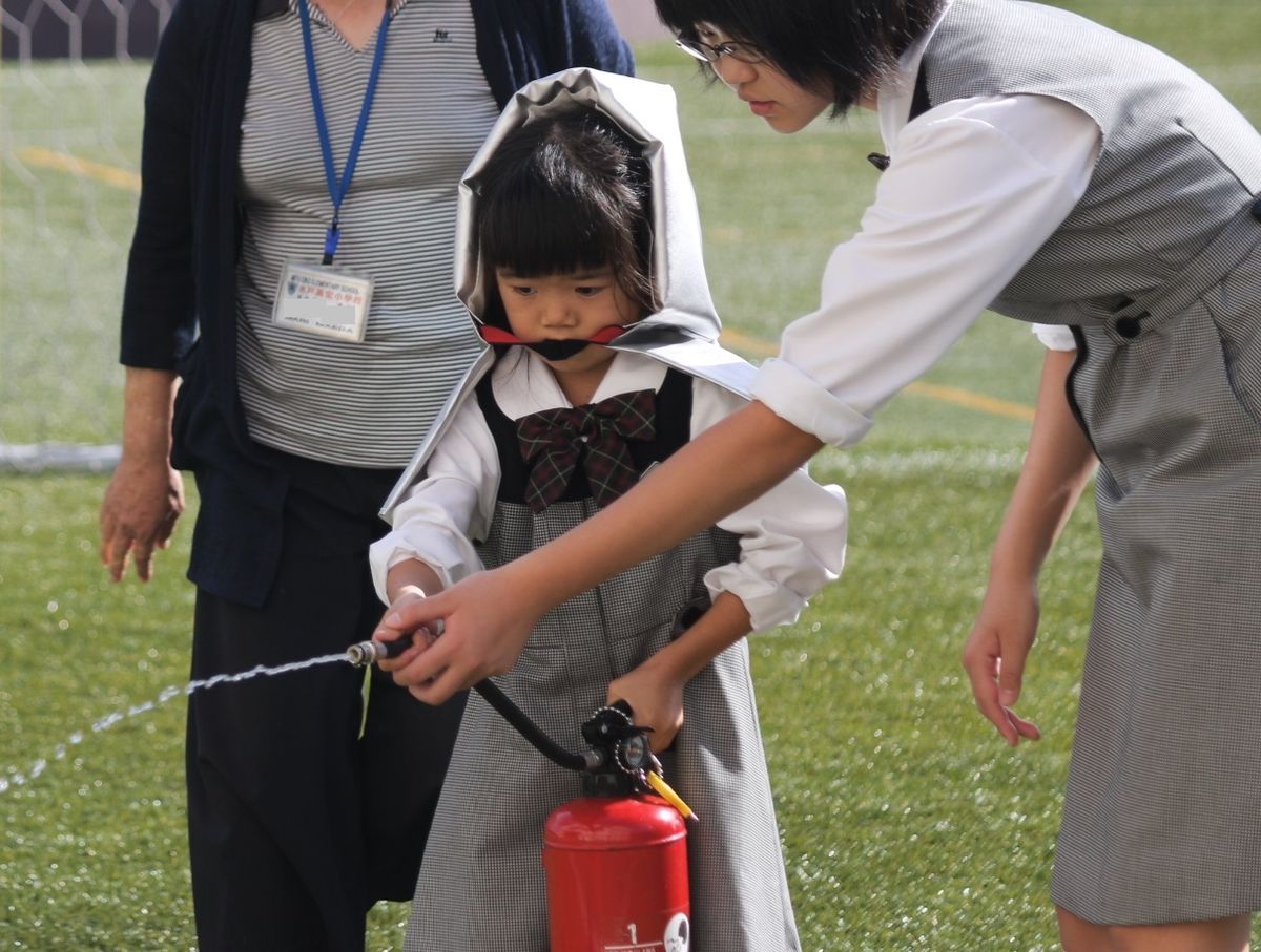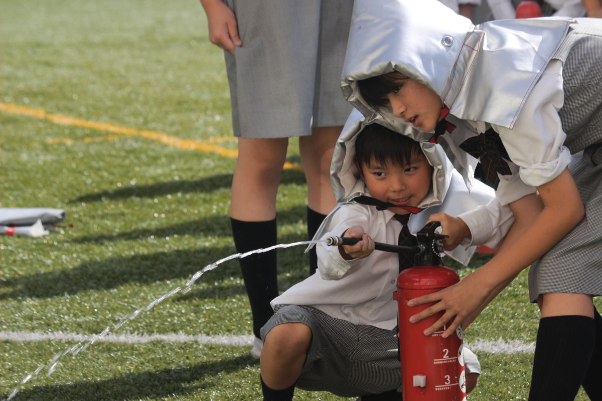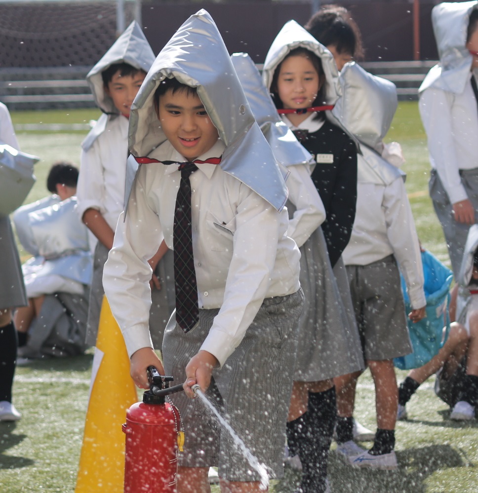 低学年にとって消火器は重くて扱いにくいものの様でしたが、一生懸命に真剣にとり組んでいました。