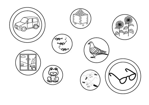 二重丸で囲んだ左上の「くるま」から右下の「めがね」まで、しりとりでできるだけ長くつながるようにして、鉛筆をつかって線で結びましょう。