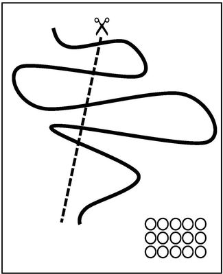 つぎのようなひもを、はさみで点線の部分のように切ると、ひもはぜんぶで何本になるでしょう。