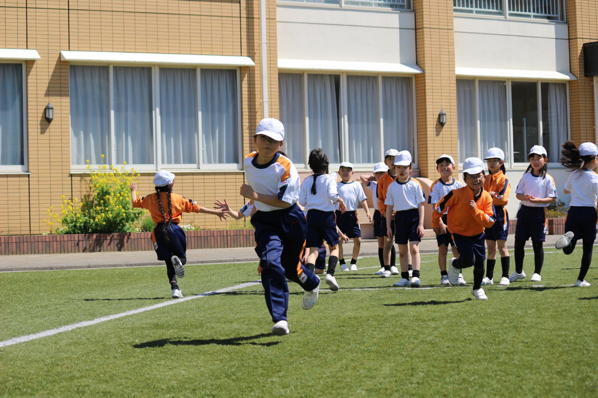 あたたかな日差しの中,グラウンドからは子どもたちの元気な声が聞こえてきます。3年生は,体育でかけっこの学習をしています。「2+1+・・・・1は?」5(GO)になったらスタートできるようです。計算混じりのおもしろかけっこです。