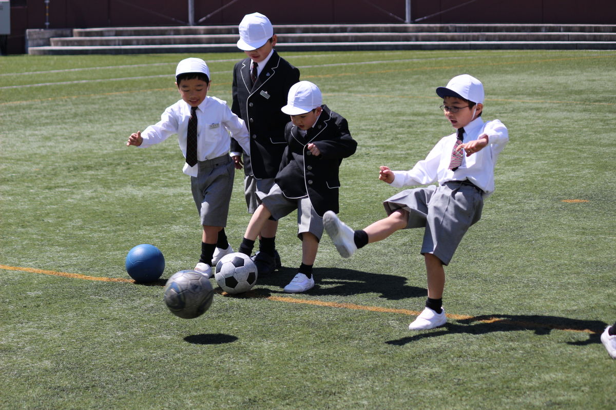 1年生は今日から普通日課になりました。中休みには,ふかふか人工芝でサッカーを楽しんでました。