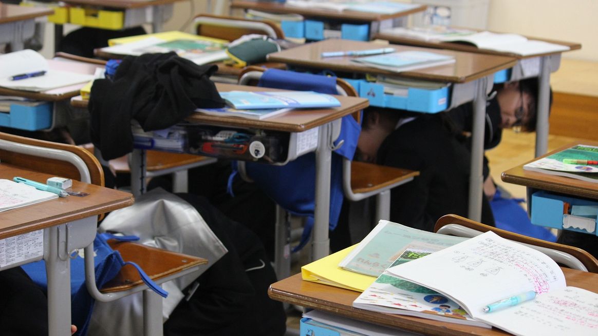 机の下での揺れがおさまるのをまつこと。建物倒壊から安全な場所に避難すること。どの児童も真剣に取り組むことができました。