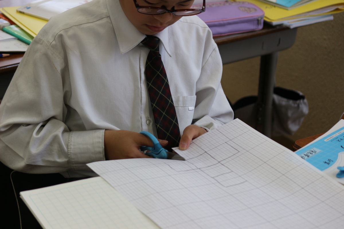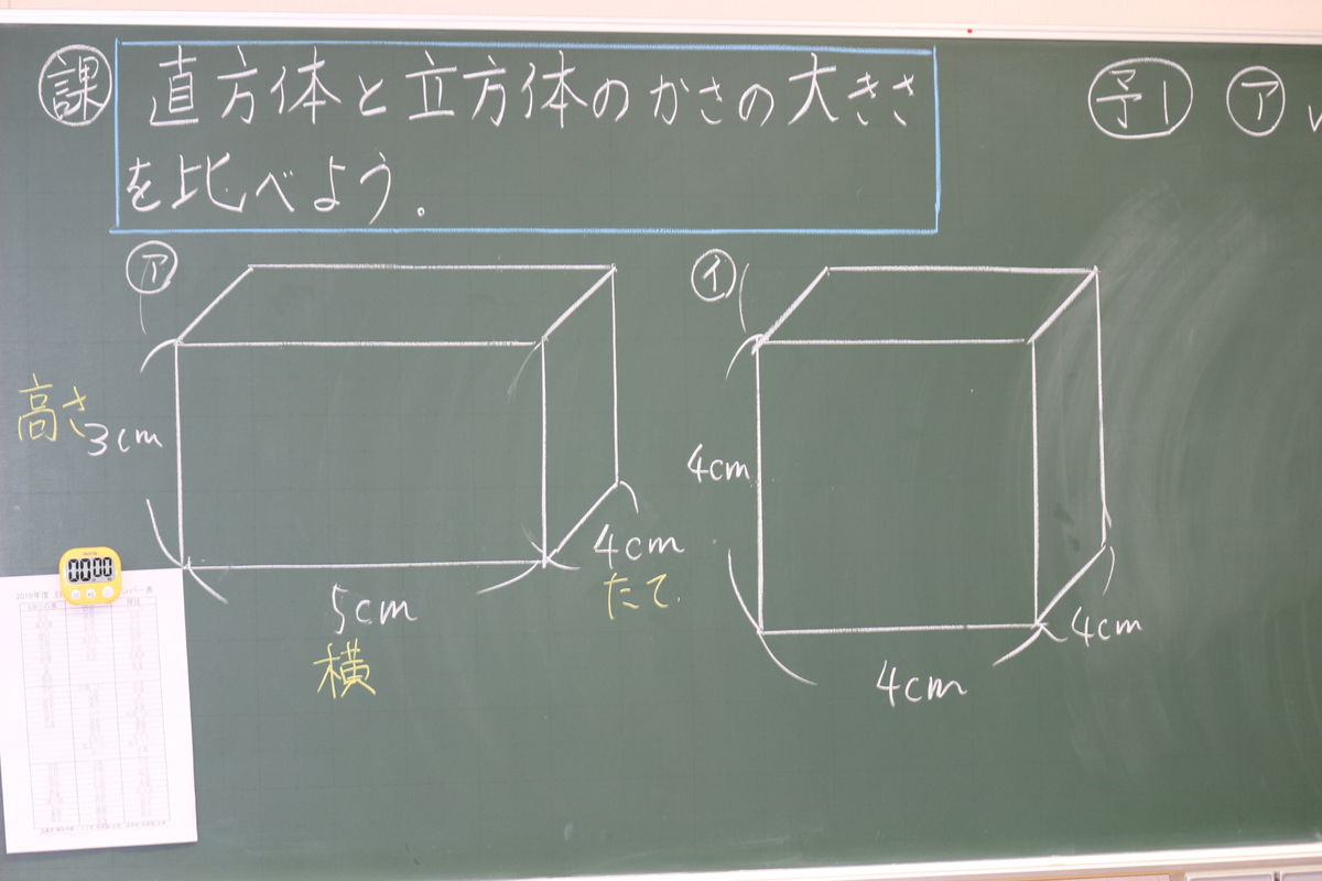4年生の算数の授業風景です。5年生内容の体積の単元に入りました。直方体と立方体の体積はどちらが大きいか?どちらがどれだけ大きいか?任意単位である㎤を学ぶ学習が始まっています。