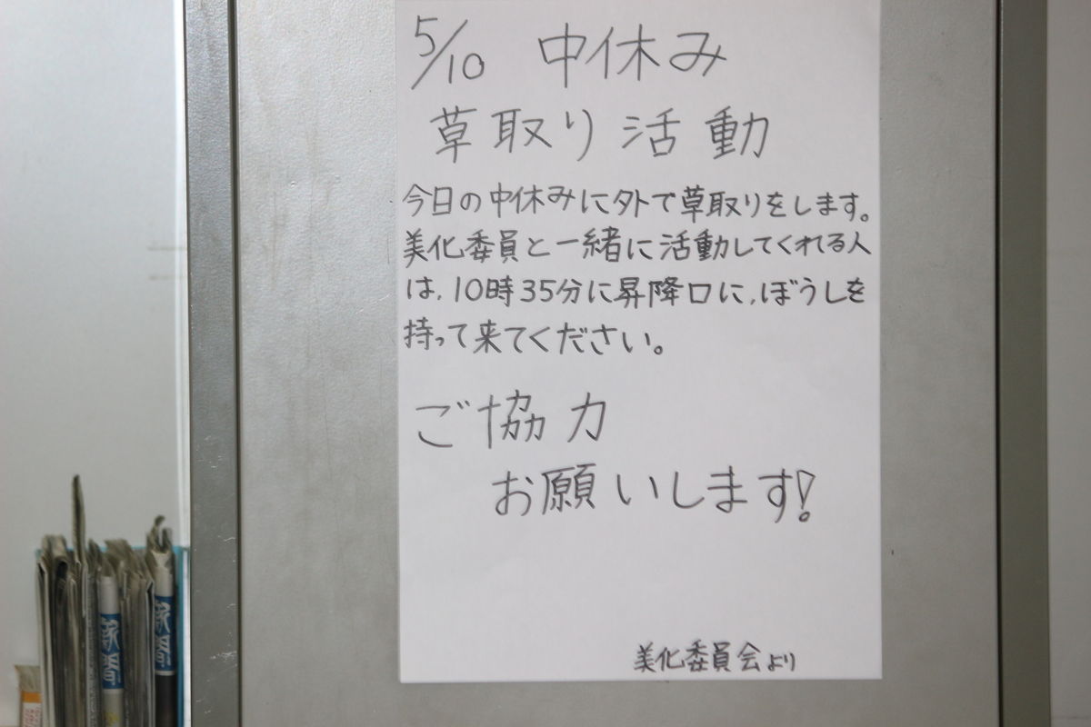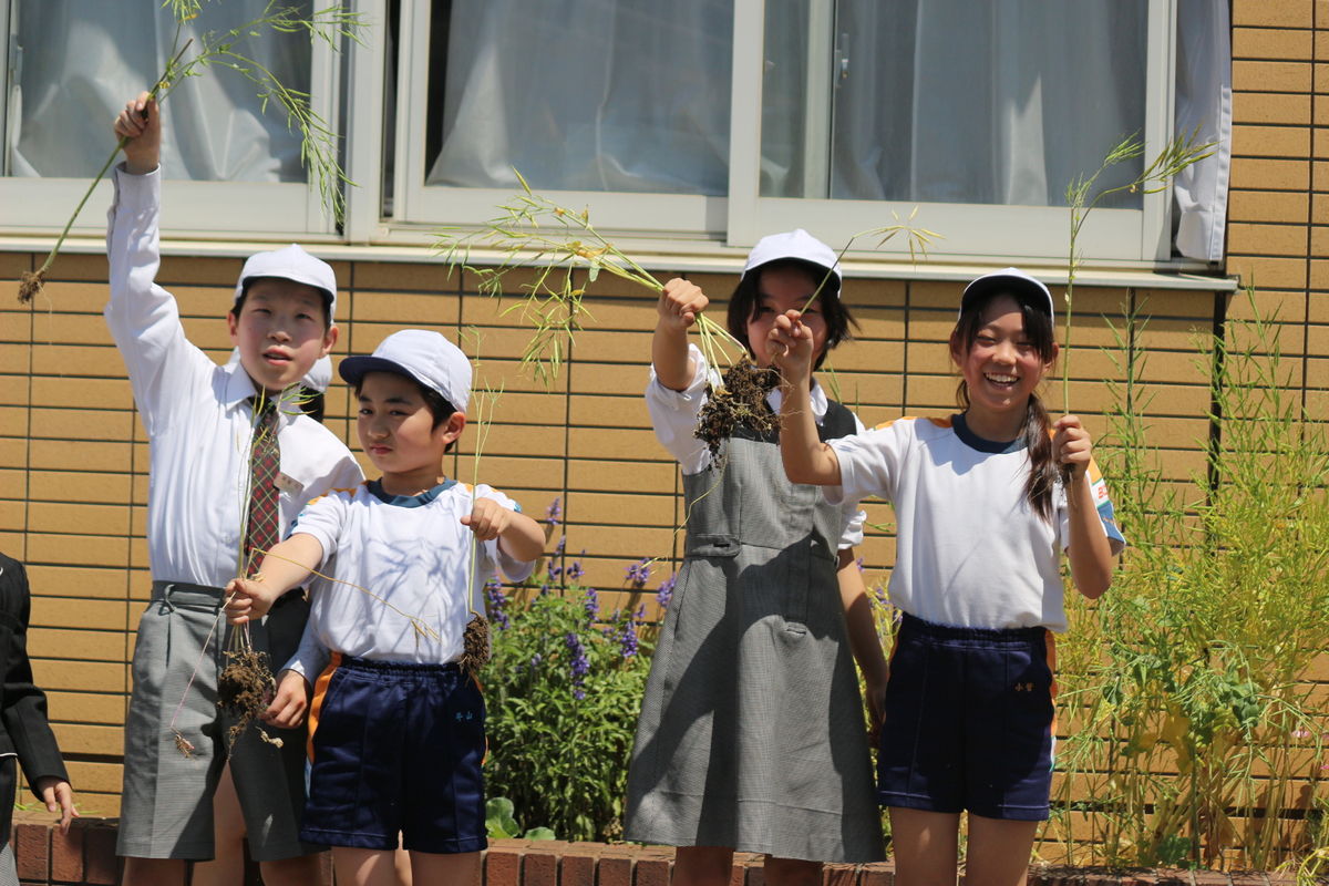 草が生い茂ってきたのに気づいた,5・6年生の美化委員会が中心となって,全校に放送やポスターで呼びかけをして有志で実施した自主的な活動でした。