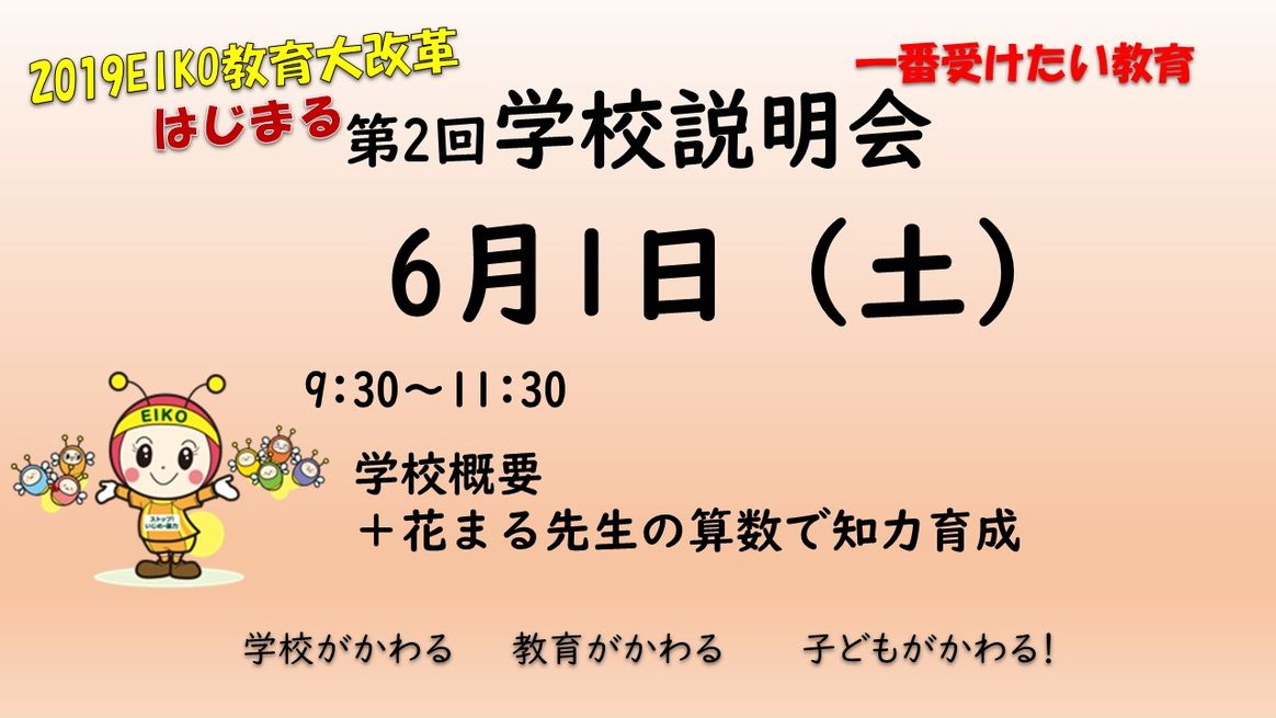 6月1日(土)第2回学校説明会を実施いたします。日本一の学び舎をめざす英宏小学校は,2019EIKO教育大改革を実行して「一番受けたい教育」をお子さまに提供するため,今年度から英宏小学校の教育がさらにパワーアップしております。私立小学校の特色や学校概要・教育内容についてお知りになる機会となりますので,入学・転学をご検討されている方のご参加をお待ちしております。