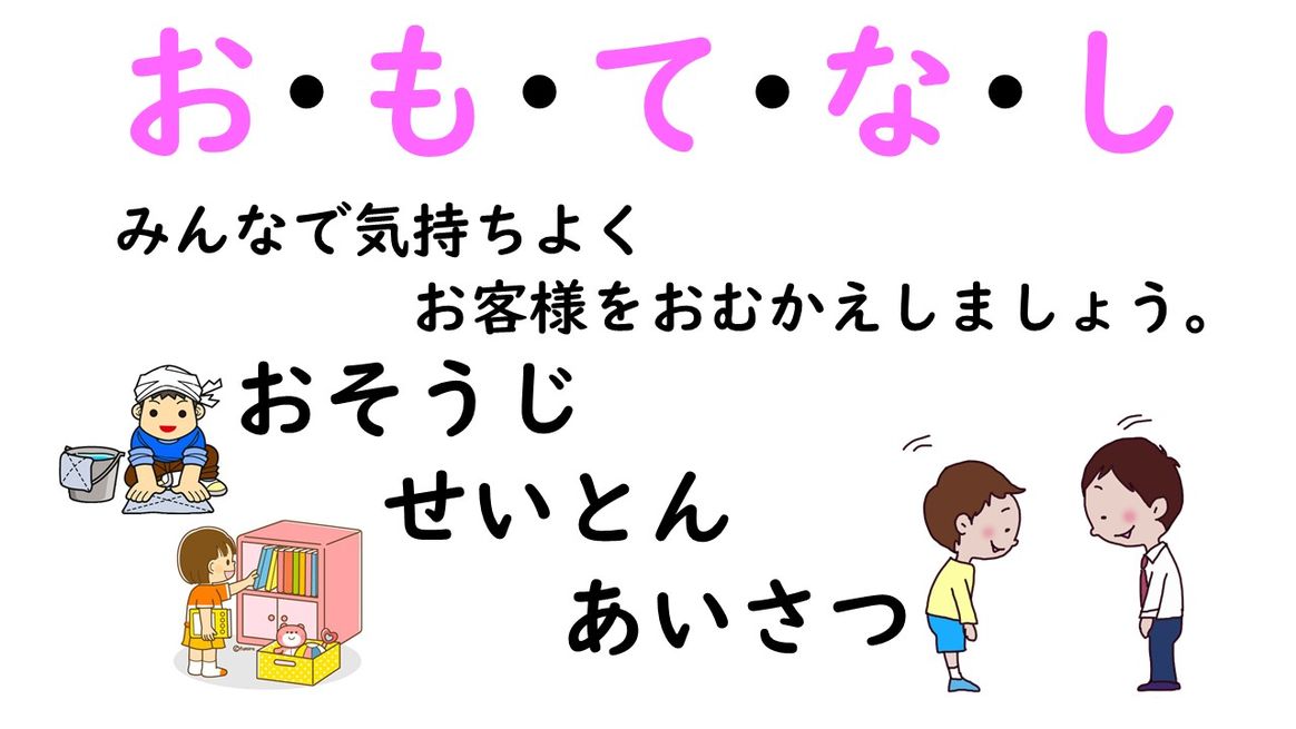 英宏小学校では,お客様がいらっしゃるときは,「お・も・て・な・し」の心で,きれいに礼儀正しくお迎えすることを指導しています。