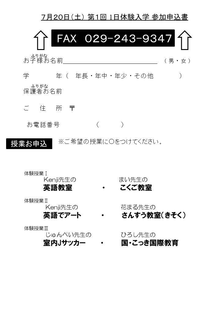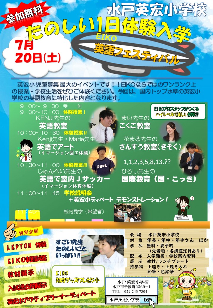 7月20日(土)本校児童募集の最大のイベントで,オープンスクールとなる「たのしい1日体験入学」を開催します。