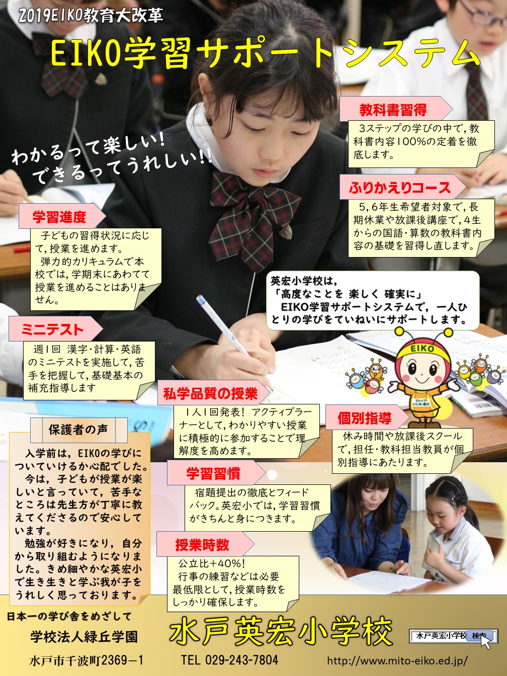 英宏小学校の学習は,最高水準などの高度なことも進めます。小学校の基礎的・基本的な知識・技能を確実に身につけることにも力をいれていて,子どもたち一人一人の力を確実に伸ばすきめ細やかな指導を受けられるのもEIKOの魅力の1つです。