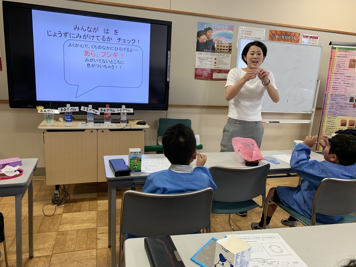 6月は虫歯予防月間です。全学年歯磨き指導を実施して,最後は2年生が行いました。