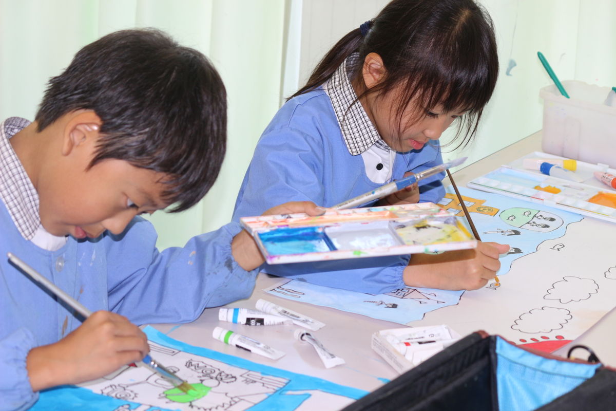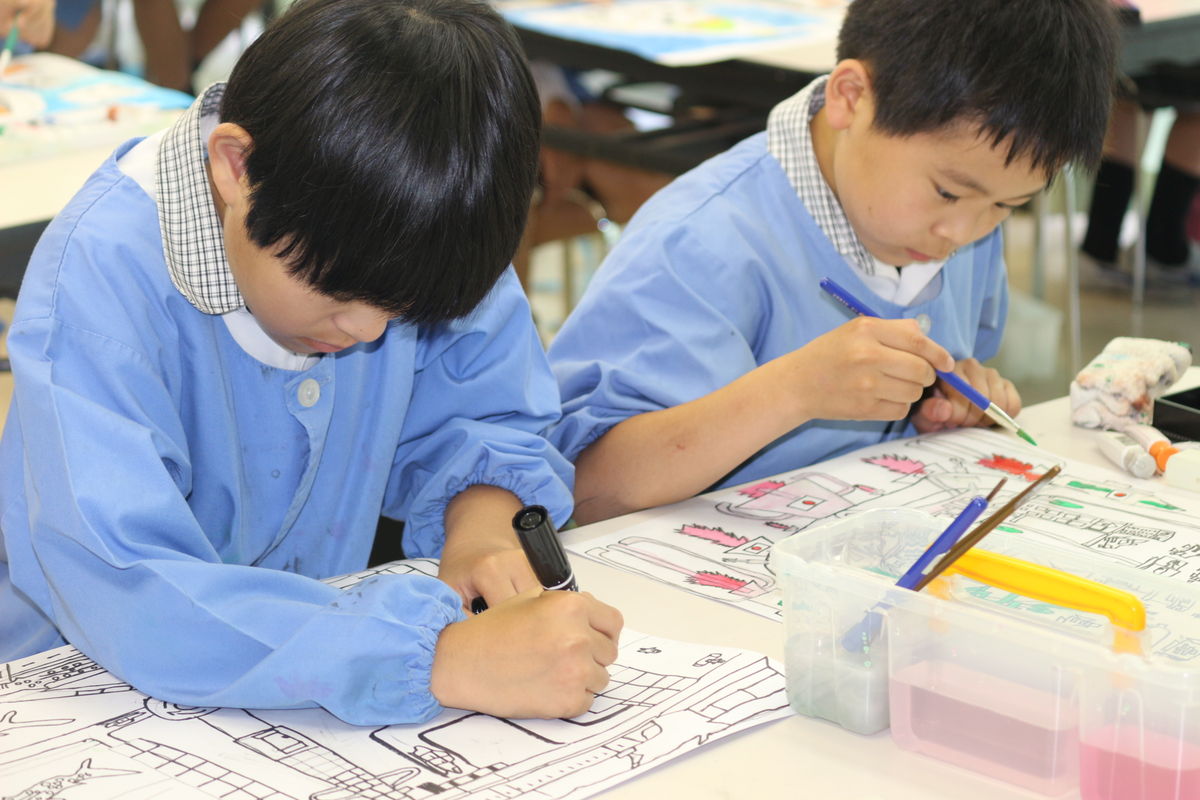 特別棟の図工室で4年生が真剣に絵画に取り組んでいました。