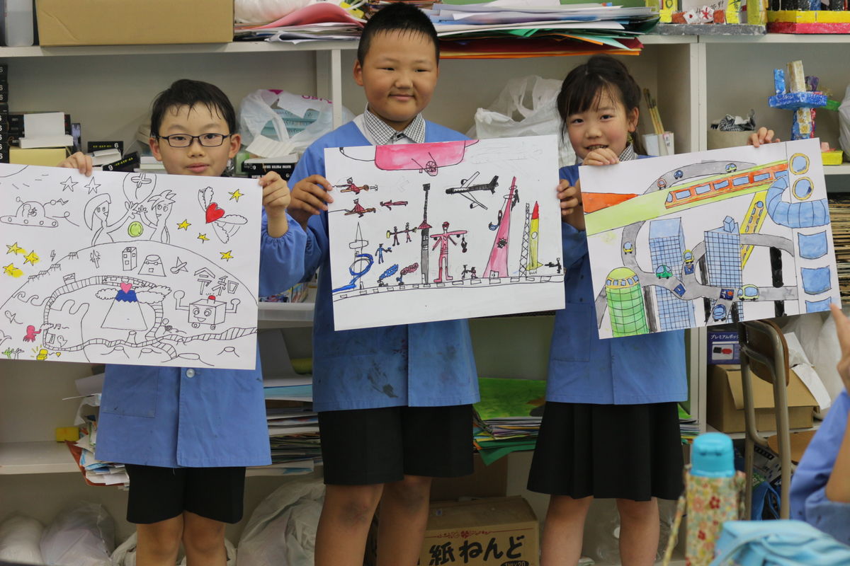油絵が専門のかずき先生が,「未来の街」を題材として,のびのびとした子どもたちの絵をかくのを指導していました。