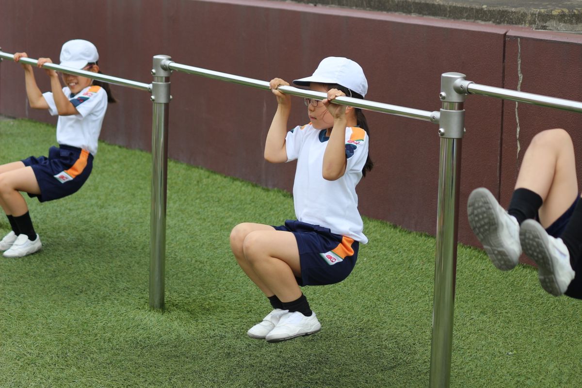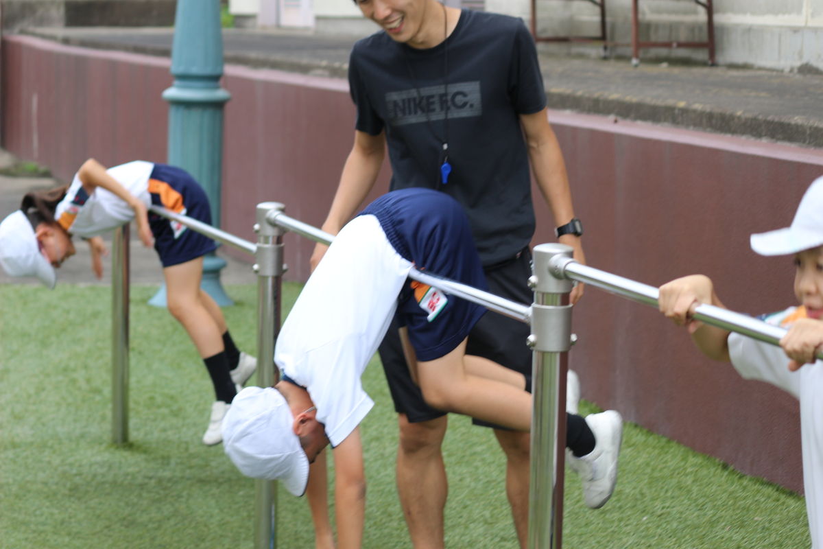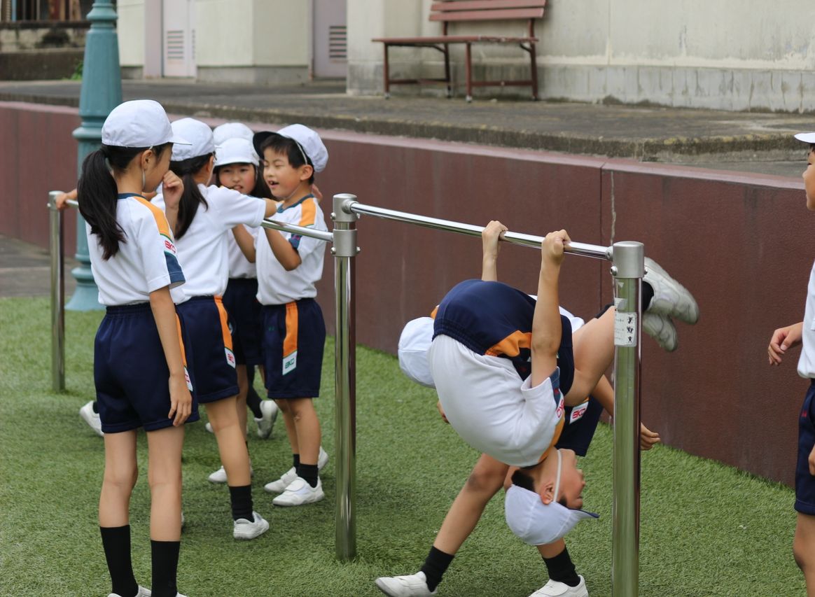 3年生が鉄棒に挑戦していました。じゅんぺい先生が紹介する技に,熱心に取り組んでいました。