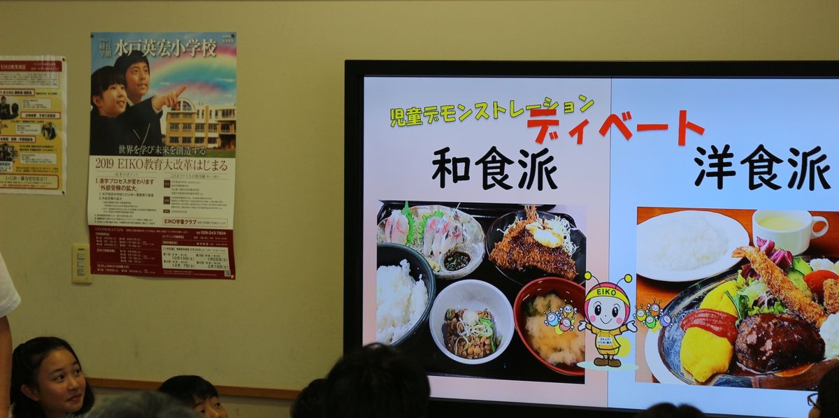 今回の学校説明会では,英宏小学校の子どもたちを前面にしたデモンストレーションを行いました。代表児童によるディベート。和食vs洋食。SDGsvs開発