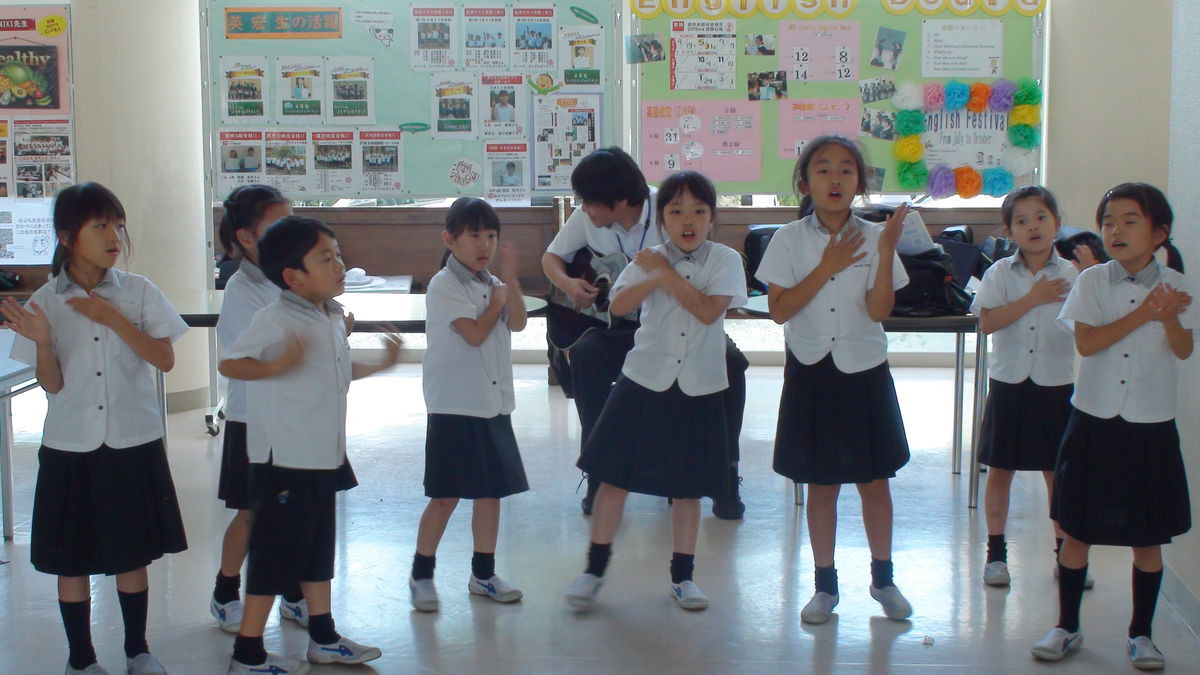 休み時間に花まる先生のギター伴奏で、子どもたちが「パプリカ」を踊りながら楽しく歌っていました。