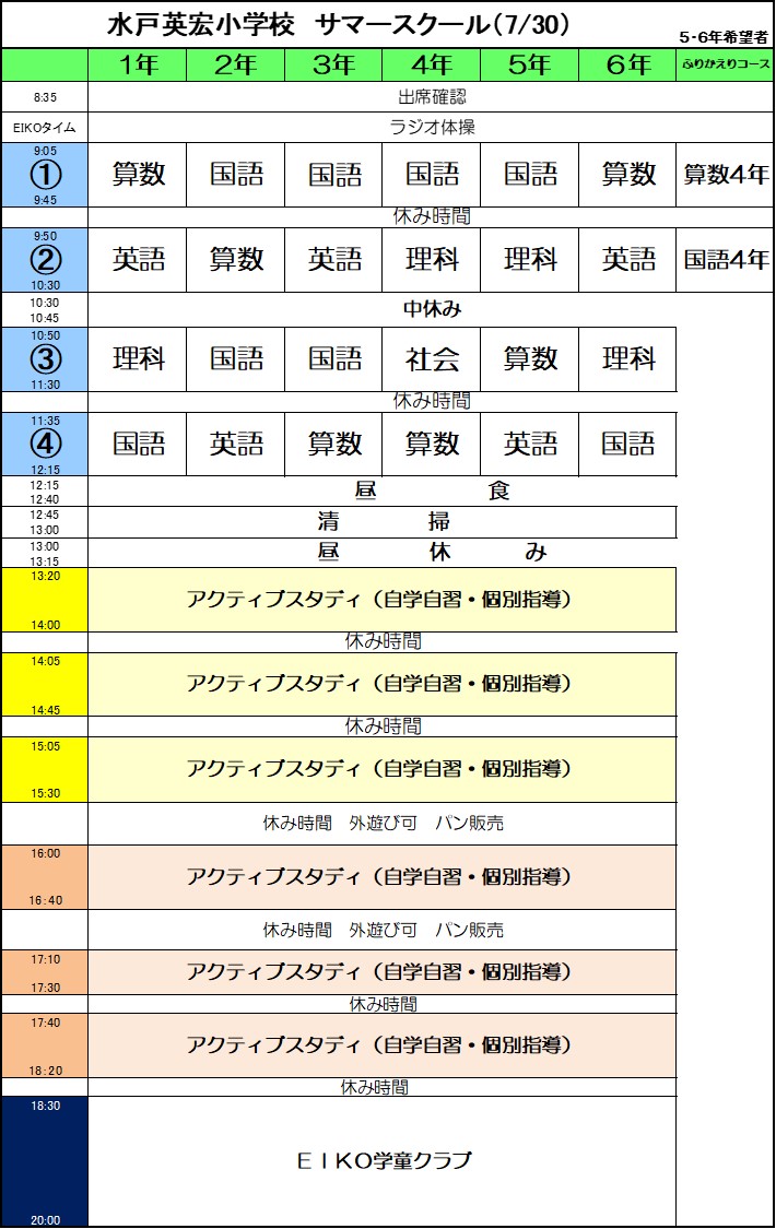 サマースクール2日目の時間割です。参加費は無料で,子どもたちの出席は自由で,登下校も自分の時間にあわせて自由に登下校することができます。午前中は主要教科を,午後は自学自習で夏休みの宿題に取り組んだり,受験対策に取り組んだり,読書や折り紙・工作などをしたりしています。