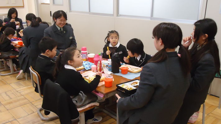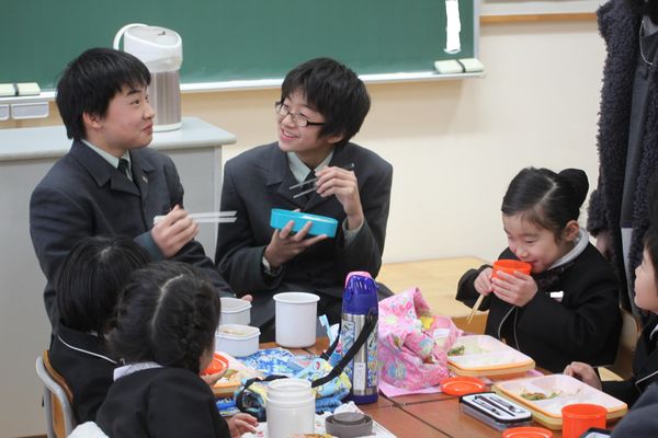 今月は小・中の交流活動の一環として英宏小生と英宏中生が一緒に昼食の時間を過ごす「EIKOなかよしランチ」をおこないます。初日の今日は英宏中の1年1組の生徒が小学校の教室を訪れ,かわいい小学生たちと一緒に昼食をとりました。