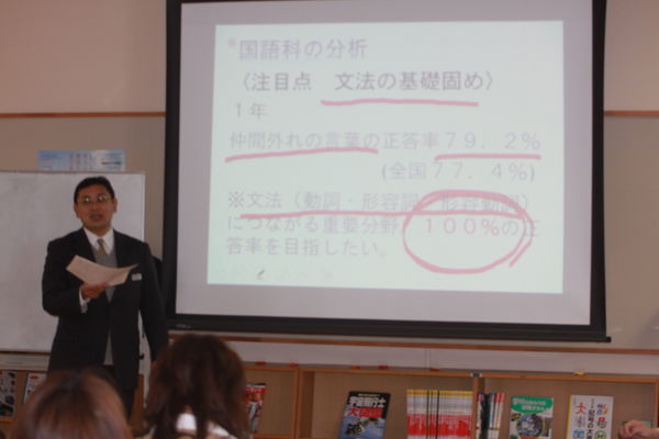 その中で,国語科では文法の指導をしっかりとしていくこと,算数科では難問を図を使って解くことのよさ,また,理科・社会の学習について説明をしました。