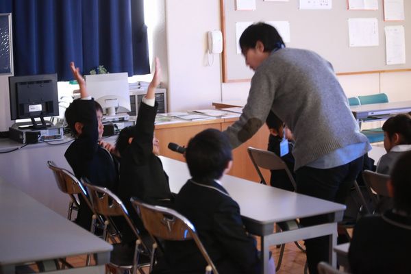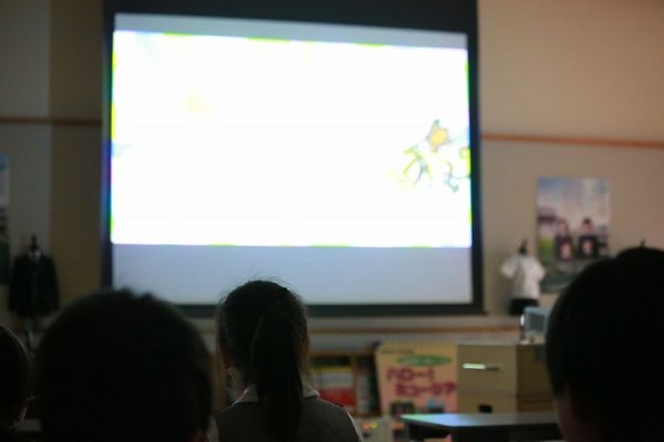 今回のハローミュージアムでは美術館スタッフの指導のもと、「気持ち」や「音」、「色」などを「言葉」を使って表現するプログラムがおこなわれました。子どもたちは日頃からアートゲームや校内の複製画などを通して、美術に親しんでいます。スクリーンに登場する絵を見る度に歓声があがります。