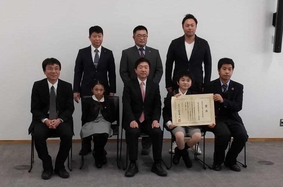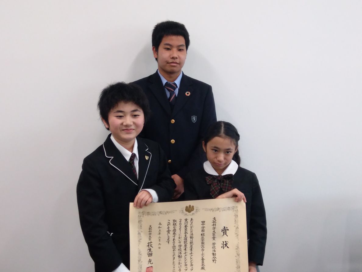 「脱炭素チャレンジカップ2021」文部科学大臣賞受賞の報告に、田中学園・緑丘学園の生徒・児童が水戸市役所を訪問、市長を表敬しました。