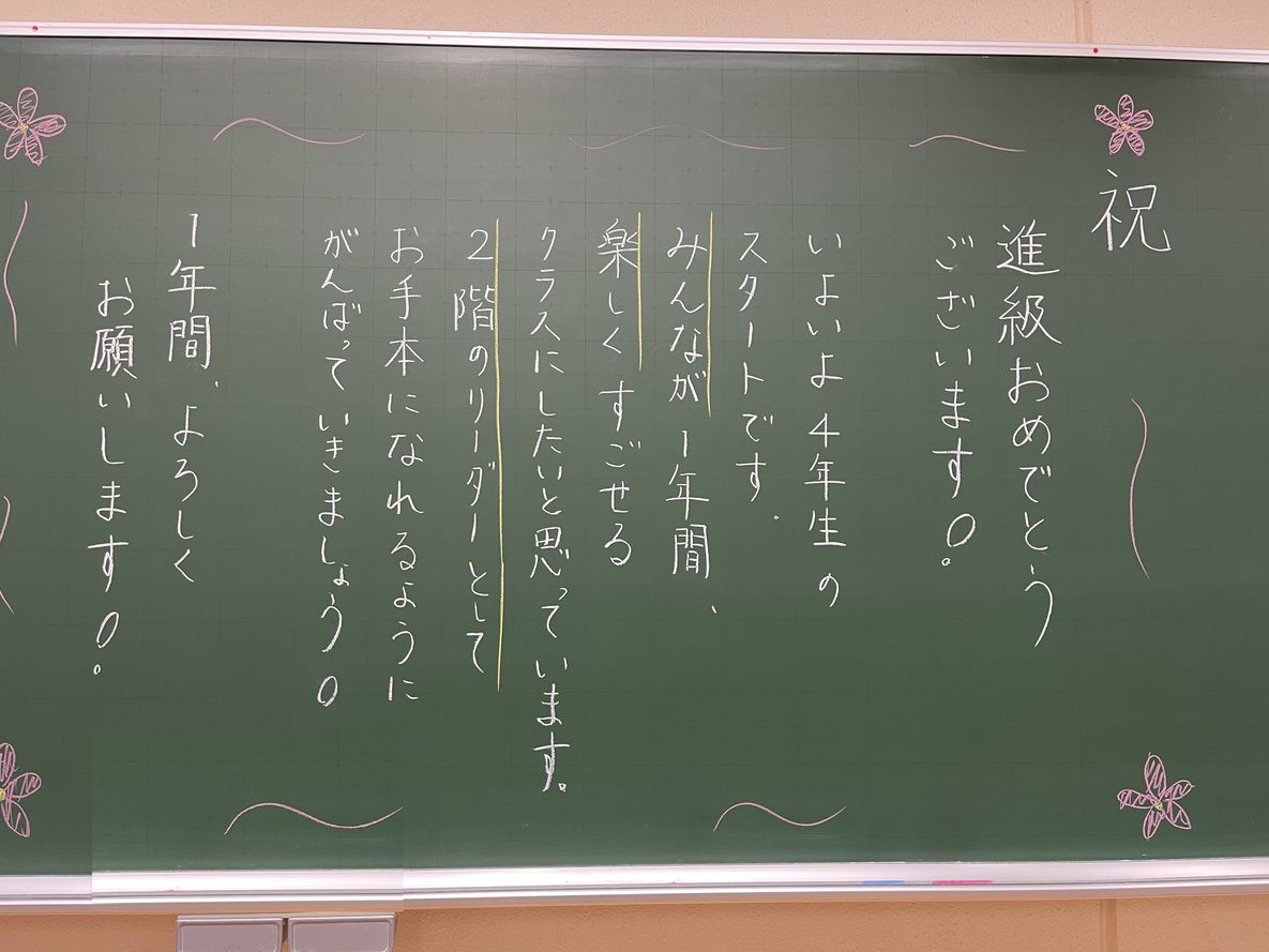 教室には,新担任から子どもたちへ向けたあたたかいメッセージがすべての学級の黒板にかかれていて,メッセージを読む子どもたちの表情もとても和やかでした。