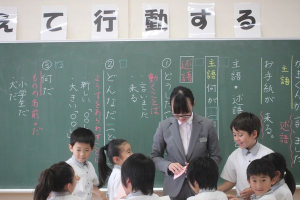 研究授業2日目はちひろ先生の国語の授業が公開されました。今日の2年生の国語は文法事項の理解を中心に進められました。主語・述語の理解は中学文法の基礎にも繋がる重要事項です。ちひろ先生は主語・述語ゲームで子どもたちにたのしく文法を教えました。子どもたちからも「主語って何かよくわかりました」「主語・述語ゲームを今度もやってみたいです」という声があがっていました。研究授業のあとは授業を様々な角度から検討をして、授業力のさらなる向上をめざします。