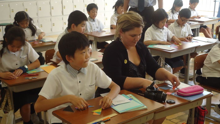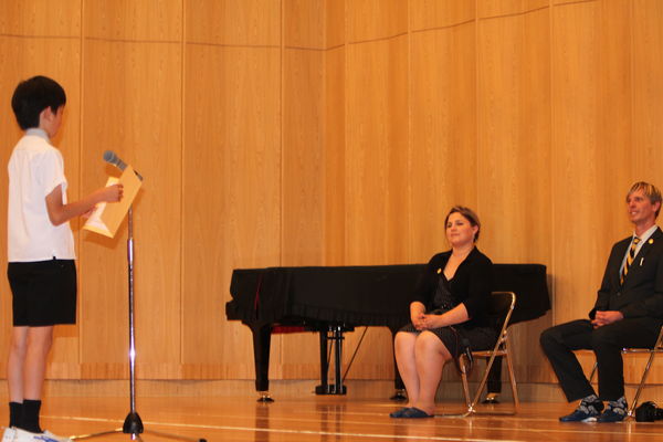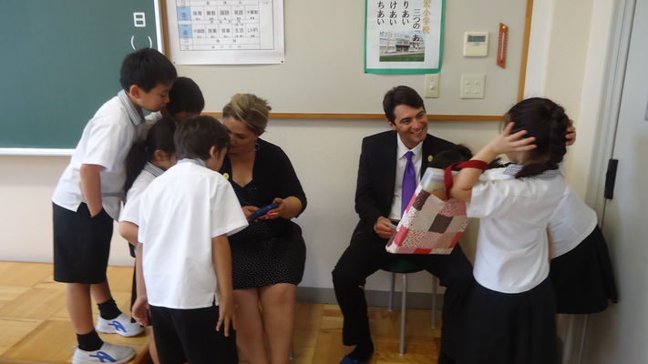 今日から3日間、英宏小学校と英宏中学校にカリフォルニア州のCTOY(California TEACHERS of YEAR)の5名の先生方が視察のため滞在します。英宏小学校にホームステイするのはマーティン先生とベロニカ先生の2人。小中合同のウエルカムセレモニーのあとは英宏小学校の授業や清掃、帰りの会やアフタースクールの様子などをじっくりと見ていただくとともに、子どもたちと交流していただきました。